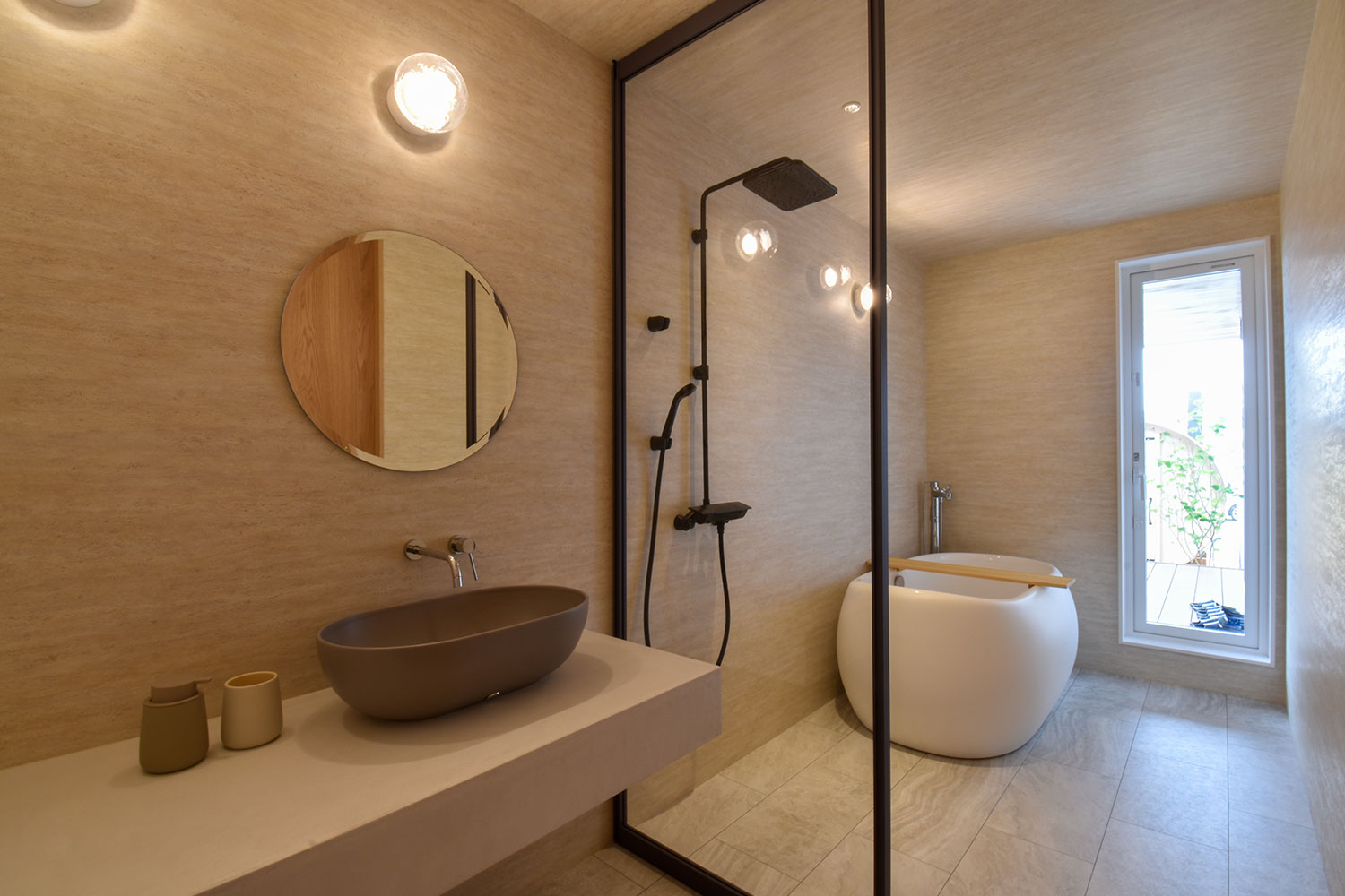 普通では物足りない方にぜひ見ていただきたい水回り。リゾート地にいるような空間を演出した洗面&バスルームです。