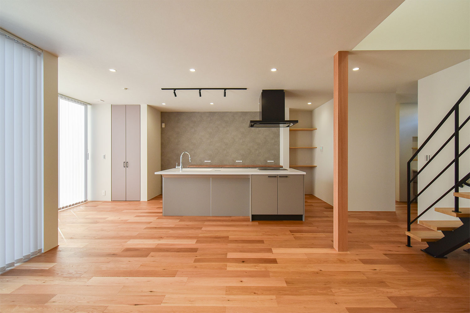 アイランドキッチンが主役の25帖のLDKは回遊動線でスッキリとして効率的。