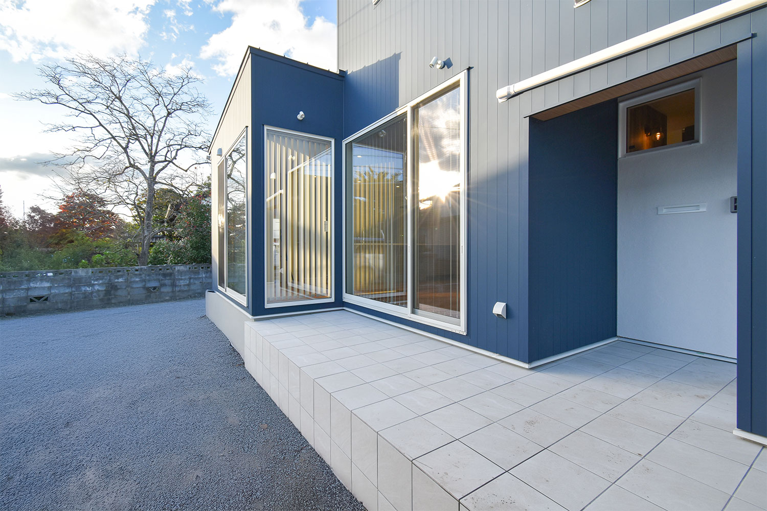 テラスは玄関ポーチとフラットに繋げることで広さとデザイン性を両立するつくりに。