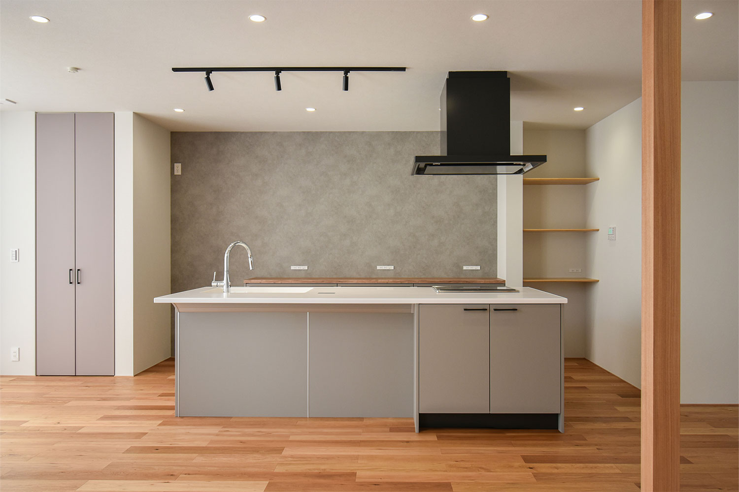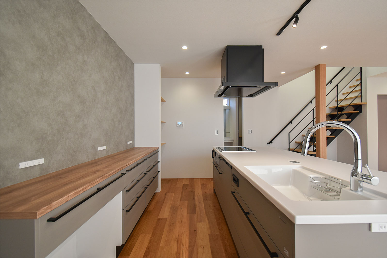 カップボード上のカウンターがアクセントになり、デザイン性もワークスペースの広さも確保しました。