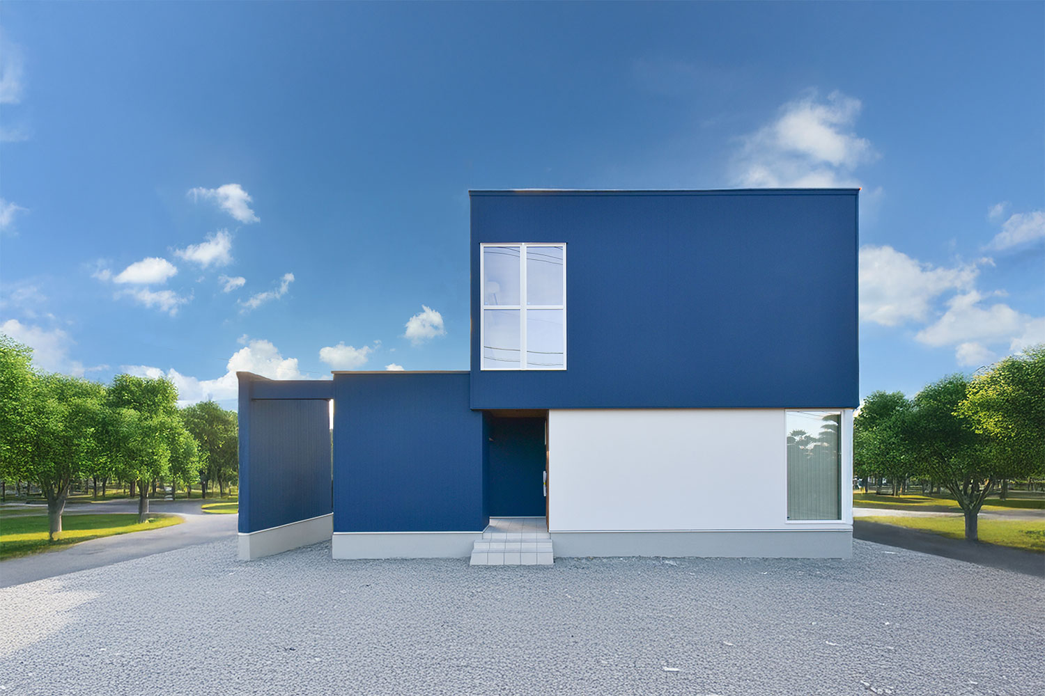 大開口のサッシがデザインの一部、爽やかな色使いの外観