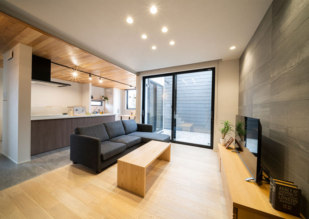 無垢調の床とグレイッシュな壁面が心地よく調和し、ダウンライトやシーリングファンの灯りがくつろぎの空間を演出。スタイリッシュでありながら、暮らしに寄り添うあたたかさを大切にした、家族の時間が自然と増える住まいです。