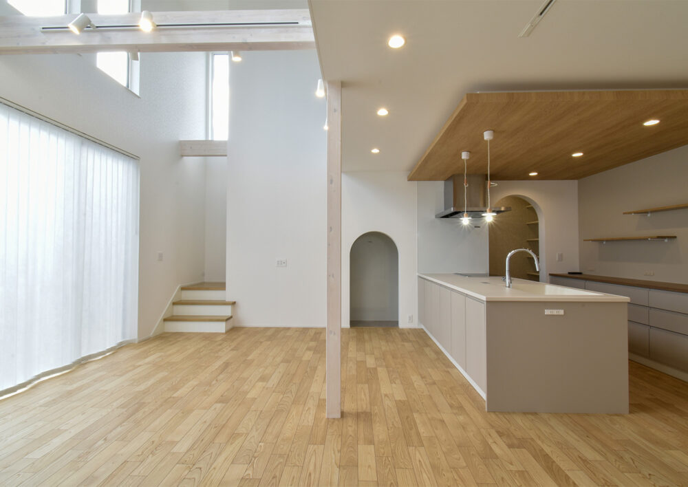 白と木目の優しい空間に、アーチ壁の曲線が可愛らしさを添えるナチュラルハウス。 化粧梁のある大空間の吹き抜けリビングは、どこにいても家族の気配を感じられる設計。 こだわりの照明やグレージュのキッチンなど、細部まで「大人かわいい」を追求しました。