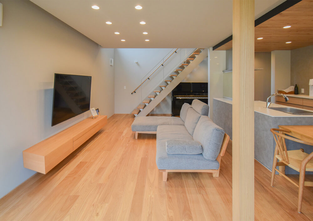 リビングには、床から浮かせた木製テレビボードと壁掛けテレビを採用しました。足元に空間ができることでお部屋がより広く見え、下をお掃除ロボットがスイスイ通れるのも嬉しいポイント。奥の階段スペースへと視線が抜ける、ゆったりとくつろげる開放的なリビングです。