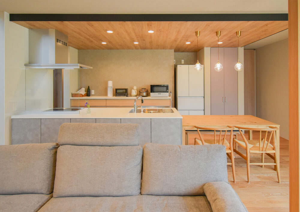 キッチンとダイニングテーブルを横一直線に配置。作ったご飯をサッと出せて、お皿を下げるのも劇的にラクになります。天井の深い木目とグレーのキッチンが、落ち着いたカフェのような雰囲気を演出します。