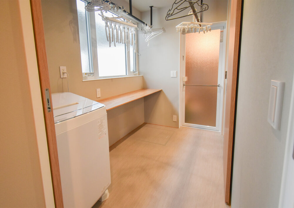天候や花粉を気にせず、洗濯物をたっぷり干せる室内干し用のサンルーム。壁際には幅広の木製カウンターを造作しているため、乾いたお洋服をその場でサッと畳んだり、アイロンを掛けたりと、あちこち移動することなく洗濯の家事がこの空間だけで完結します。