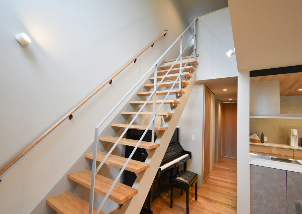 アイアン手すりがおしゃれな階段横のスペースには、ピアノを置けるゆとりを確保。吹き抜けになっているため、ピアノの優しい音色や家族の会話が2階まで心地よく届きます。縦の空間を上手に使った、家族のつながりを感じられる設計です。