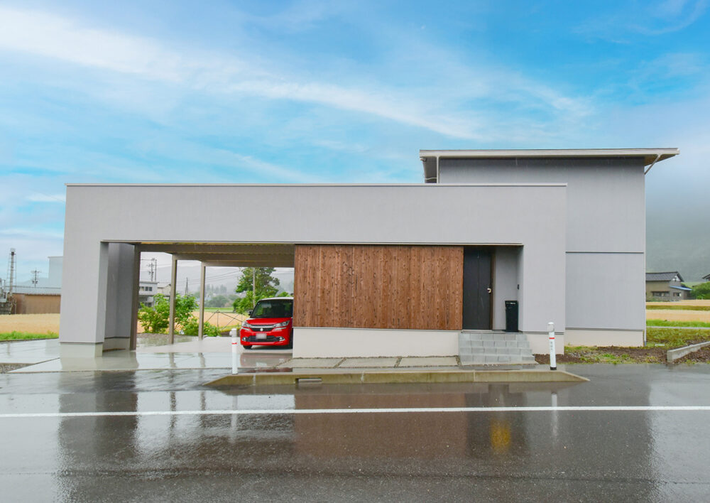 スタイリッシュで落ち着きのあるグレーの外壁に、木目調のアクセントが温かみをプラス。シンプルながらも個性が光る、飽きのこないモダンなデザインです。周囲の景色にもスッと馴染む、おしゃれな佇まいに仕上がりました。