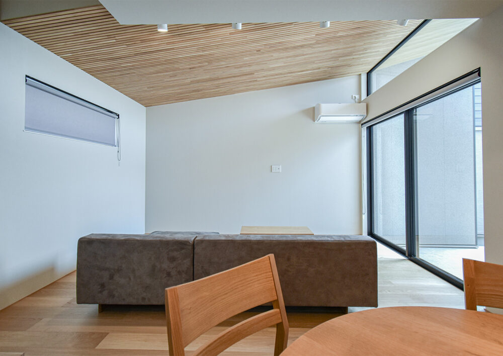 リビングには板張りの勾配天井を採用し、縦への広がりと木の温もりを感じられる空間に。大きな窓からは中庭の自然光がたっぷりと降り注ぎ、外の景色を楽しみながらゆったりとくつろげる開放的な設計です。