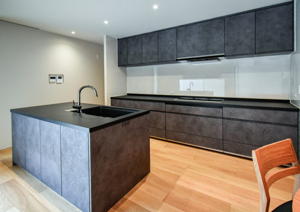 モルタル調のスモーキーな面材が美しい、フラットなアイランド型キッチン。背面収納も同素材で統一することで、生活感を感じさせない重厚でスタイリッシュな佇まいに。