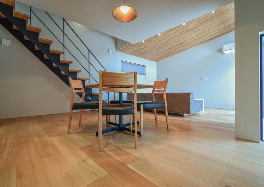 無垢材のフローリングに、空間のアクセントとなるアイアン手すりの階段が目を惹くLDK。重厚感のあるソファやダークトーンのキッチンを合わせることで空間全体がぐっと引き締まり、洗練されたホテルライクな雰囲気を演出しています。