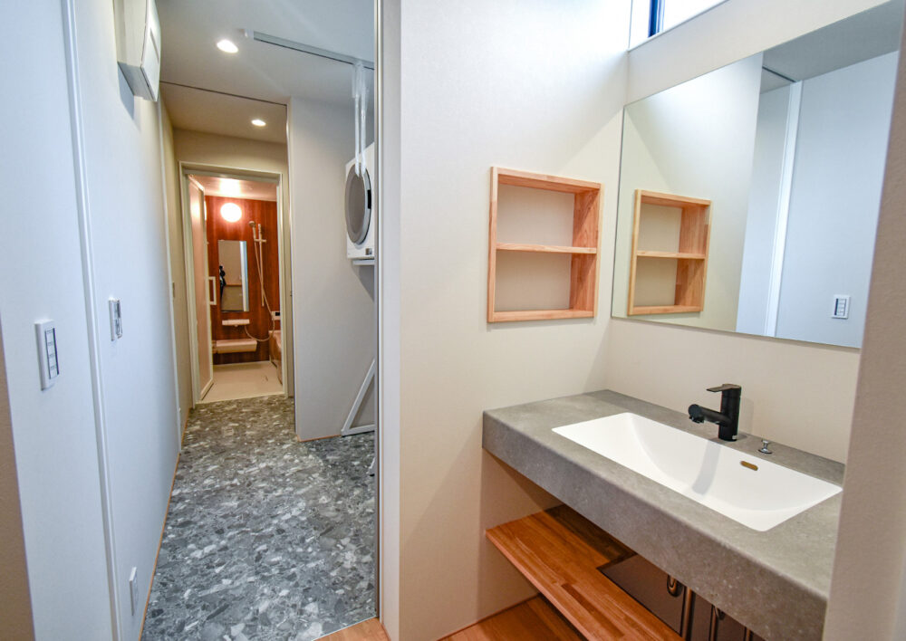 造作の洗面台は、モルタル調の天板と木目の組み合わせがモダンな印象。奥には天候を気にせず室内干しができる広々としたサンルーム、そして浴室へと一直線に繋がる、日々の負担を軽減する機能的な家事動線を確保しています。