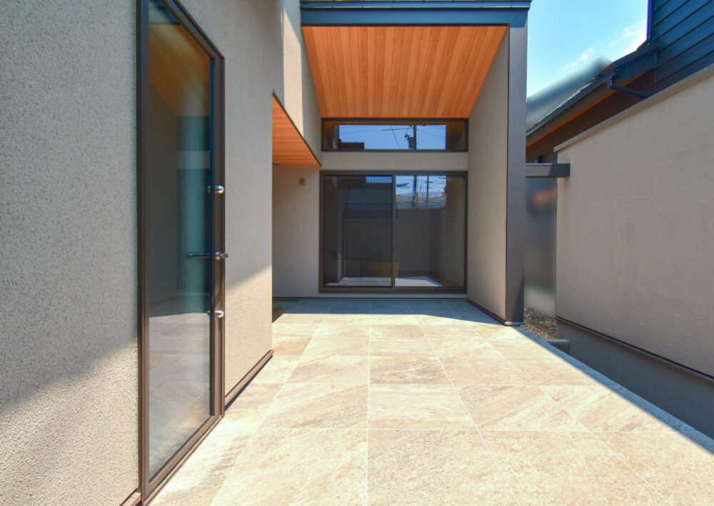 外からの視線をしっかりと遮る壁を設けた、プライベート感あふれるタイル張りの中庭。軒天にも木目をあしらうことで室内との美しい連続性が生まれ、リビングの延長として多目的に活用できるアウトドアリビングです。