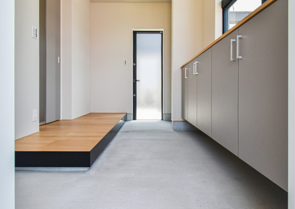 すっきりとしたモルタル土間が広がる、シンプルで無駄のない玄関スペース。フロート仕様の収納を採用することで足元に抜け感が生まれ、限られた空間をより広く、洗練された印象に見せる工夫が施されています。