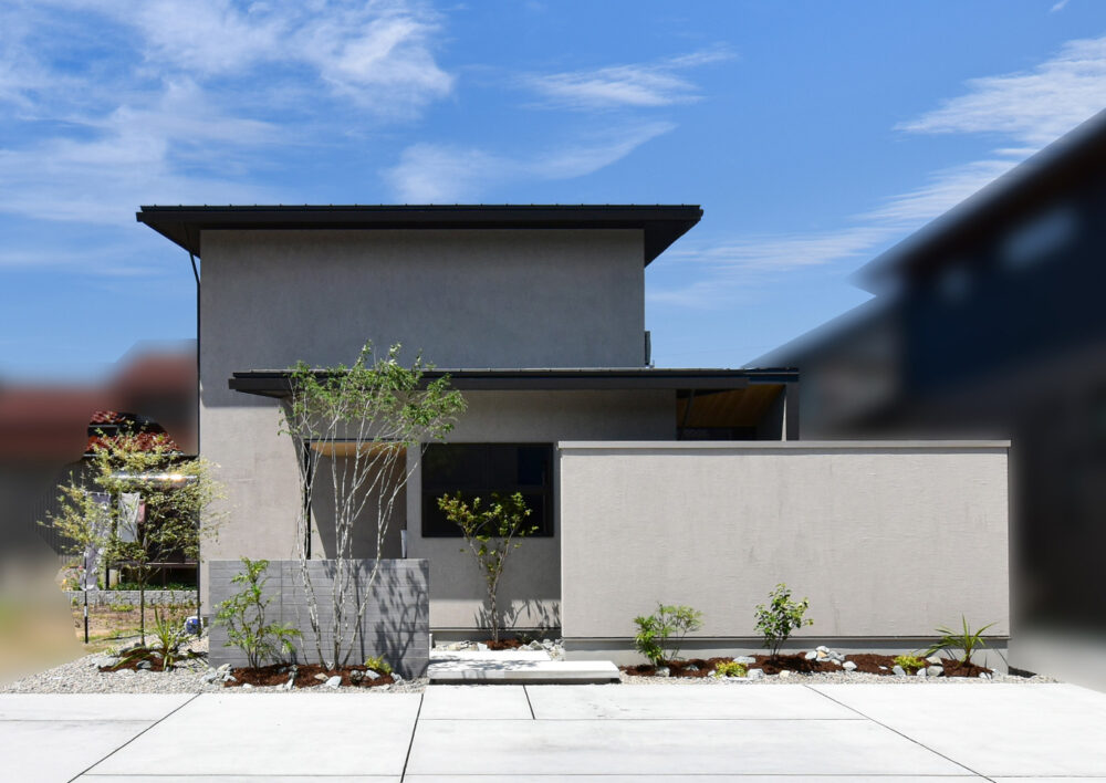 直線を基調とした端正なフォルムに、グレーの塗り壁が美しく映える外観デザイン。軒裏の木目や、アプローチに添えられた植栽の緑が、無機質になりがちな外観に温かみと豊かな彩りを添えています。