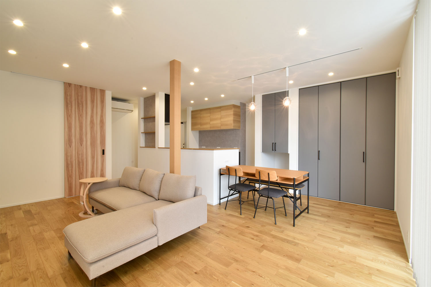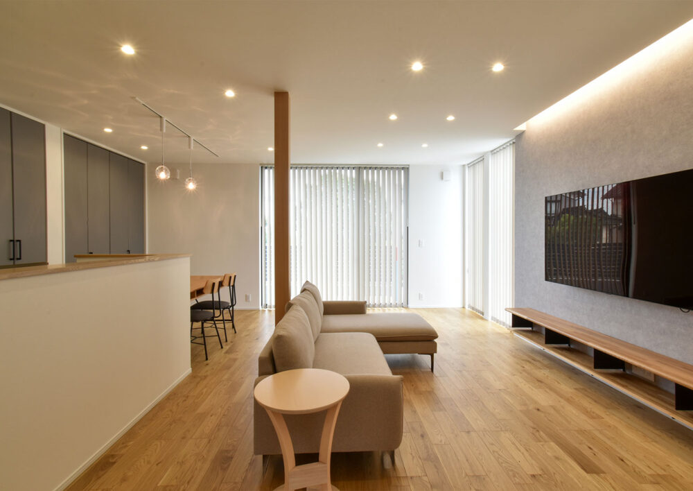 木の質感を活かしたフローリングと、グレーの建具が調和するナチュラルモダンな空間。明るさと開放感に包まれた、心地よい家族の憩いの場。