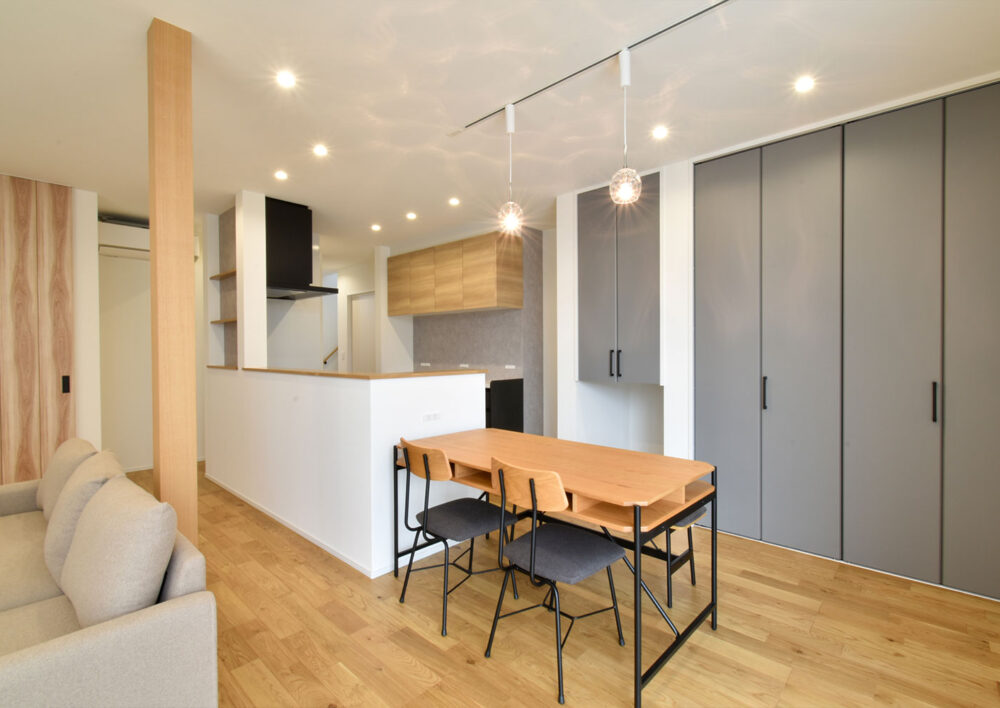 キッチンと並んだ配置で家事動線もスムーズ。家族の会話が自然と生まれる、明るく心地よいダイニングです。