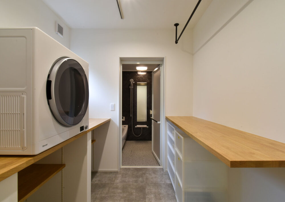 お風呂あがりから洗濯までを一連で行える便利な配置。暮らしの中で自然に効率化が叶う間取りです。