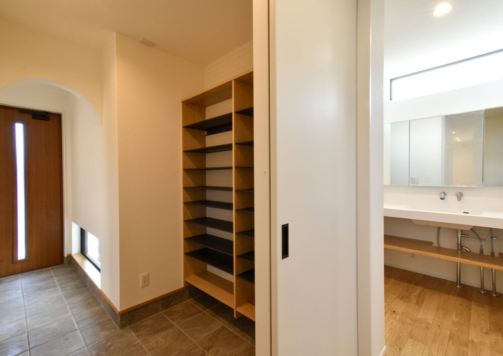 玄関横にはたっぷり収納できるシューズクロークを設け、靴やアウトドア用品もすっきり整理可能。帰宅後すぐに手洗いができる動線で、清潔で快適な暮らしをサポートします。