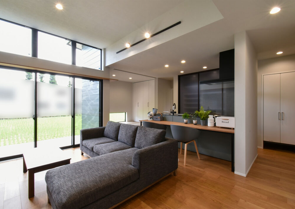 開放感あふれるリビングは、大きな窓から光がたっぷり入り、外とのつながりを感じられる明るい空間。