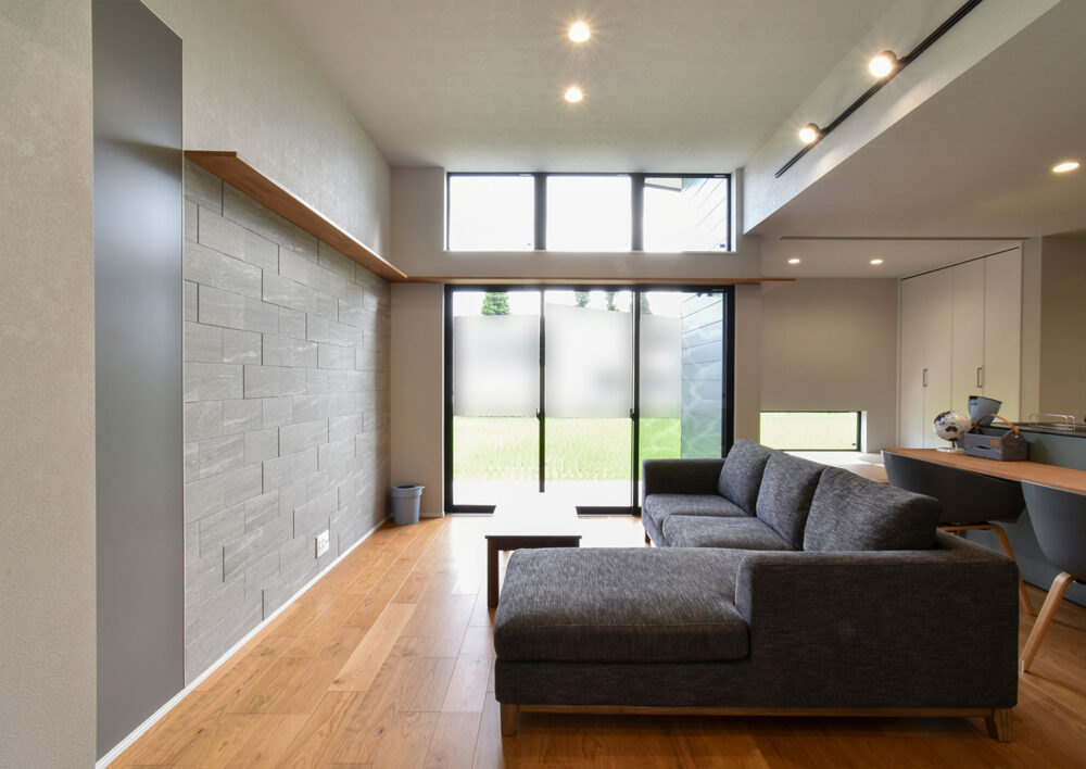 木目の床とシンプルな色合いが調和し、落ち着きと上質さを感じるリビングです。