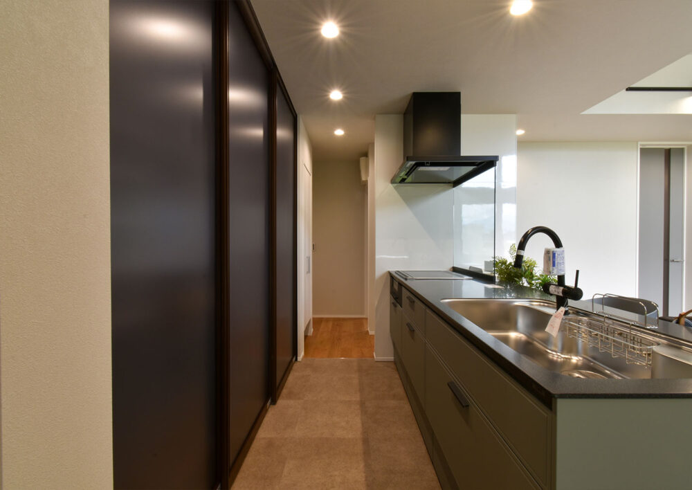 ダークトーンでまとめられたキッチンは、空間を引き締めるスタイリッシュな存在感。毎日の料理が心地よく楽しめる場所になっています。