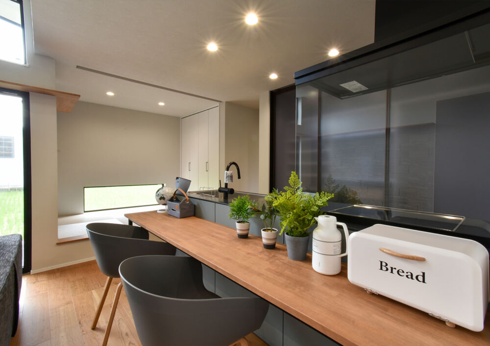 キッチンと一体になったダイニングカウンターは、食事や作業に気軽に使える便利なスペース。木目の素材感がやさしく、家族が自然と集まる心地よい場をつくっています。