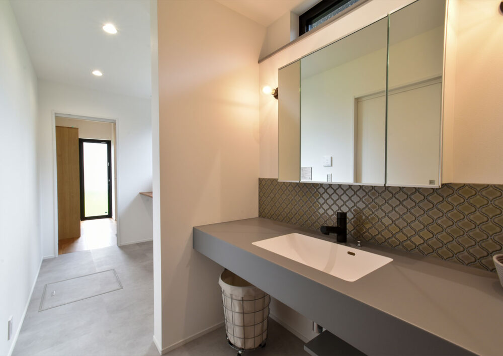 洗面所、サンルーム、ウォークインクローゼットが直結した間取りで、洗濯から収納までの動線がスムーズ。洗濯物を洗って干し、乾いたらそのまま収納できるため、家事の手間がぐっと減ります。