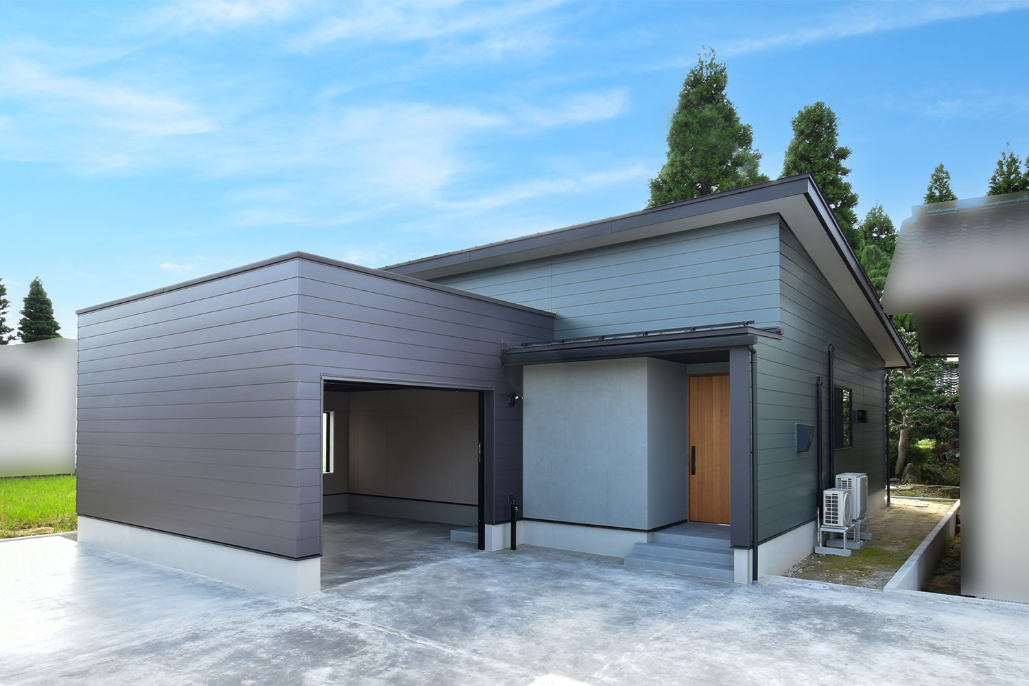 スタイリッシュで落ち着いた雰囲気。グレー系の外壁と木目の玄関ドアがバランス良く、シンプルながらも高級感があります。