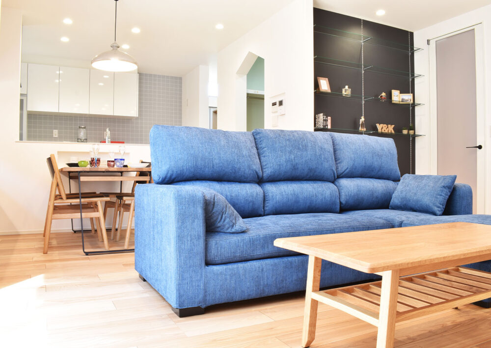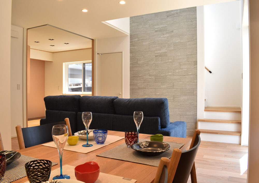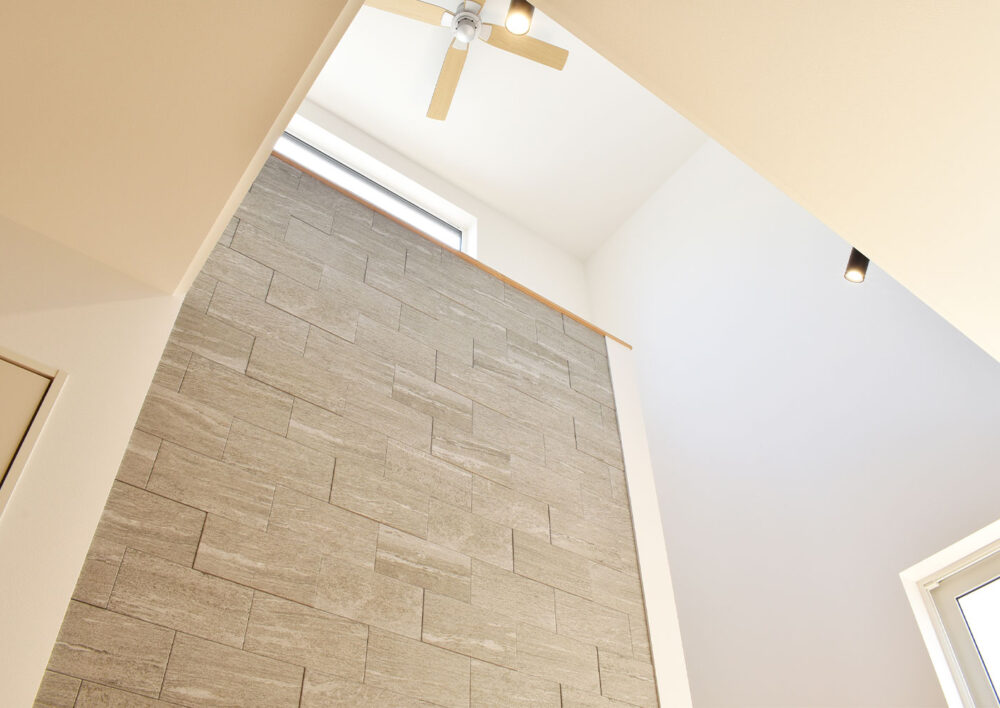 グレーのアクセントタイルが、空間に上質な深みを添えるリビング。シンプルな美しさの中に、デザインのこだわりが息づく空間です。