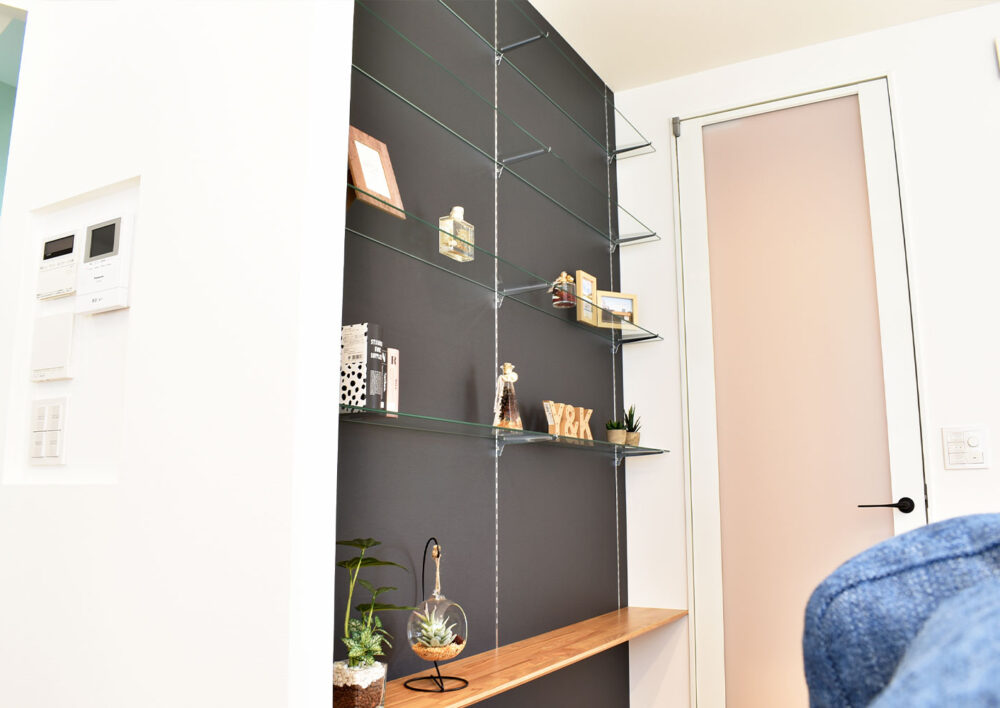 リビングの一角に設けたブラックの飾り棚が、空間を上品に引き締めます。白と木の柔らかなトーンにアクセントを添え、デザインの完成度を高める存在に。見せる収納としての機能性と、美しさを両立したディスプレイスペースです。