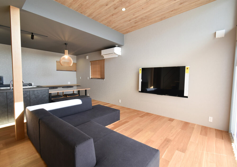 壁掛けテレビなら配線も隠せて見た目もスッキリ。グレーの背景が映像を際立たせ、没入感のあるリビングを演出します。