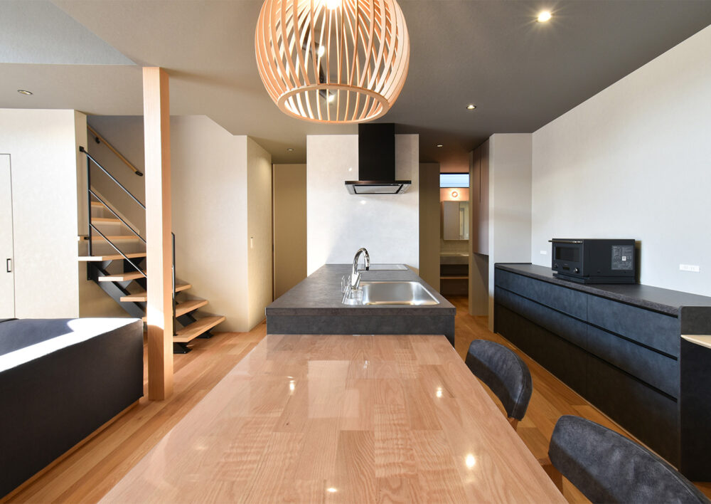 キッチンとダイニングを横並びにした、配膳も片付けもスムーズな家事ラク動線。食事中にふと目に入るアイアン階段やこだわりの照明が、まるでカフェのような時間を演出します。
