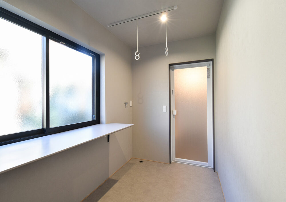 「洗う・干す・畳む」が最短距離で完結。広めのカウンターを備えているので、アイロンがけや洗濯物を畳む作業もスムーズです。