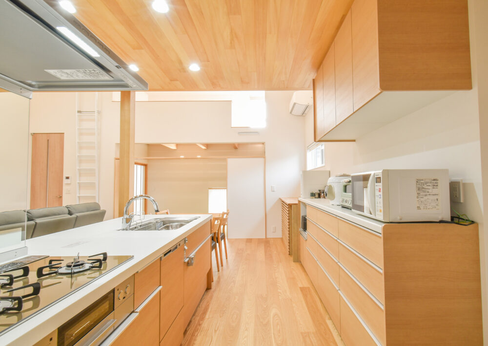 LDK全体から上部のロフトまで見渡せる、見晴らしの良い対面キッチン。背面収納も木目で統一し、家具のような美しさと使い勝手を両立しました。