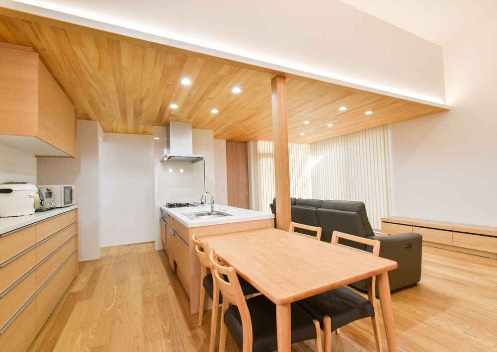勾配天井による縦の広がりが圧倒的な開放感を演出。床と天井に無垢材をふんだんに使い、木の香りに包まれるような温かみのあるLDKです。