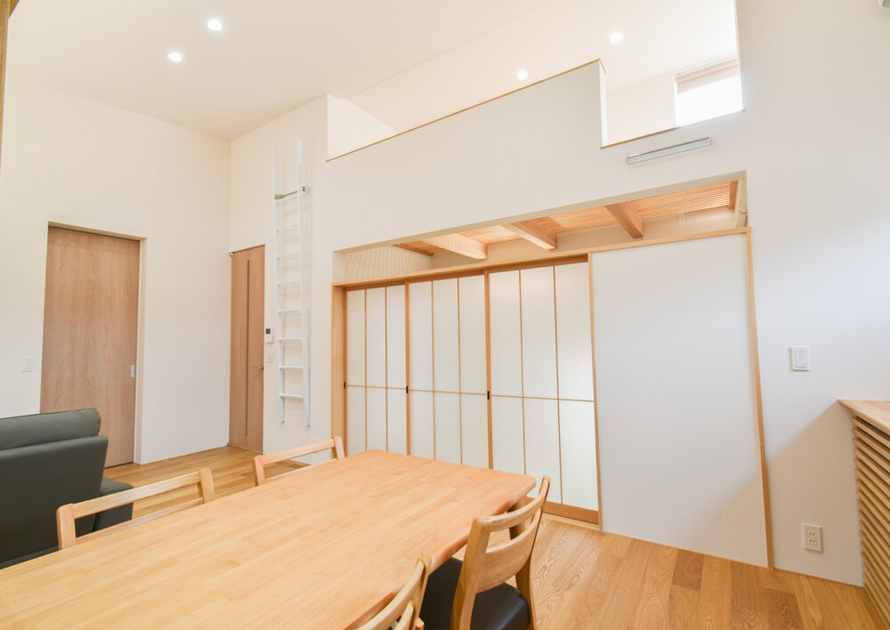 リビング横には、引き戸で仕切れる便利な和室を配置。扉を開け放てば大空間の一部となり、上部に見えるロフトの木の構造がデザインのアクセントになります。