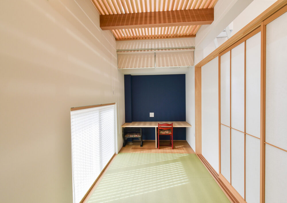 ネイビーのアクセントクロスが空間を引き締める、和室奥の書斎スペース。上部のすのこ床から木漏れ日のような柔らかな光が降り注ぎます。