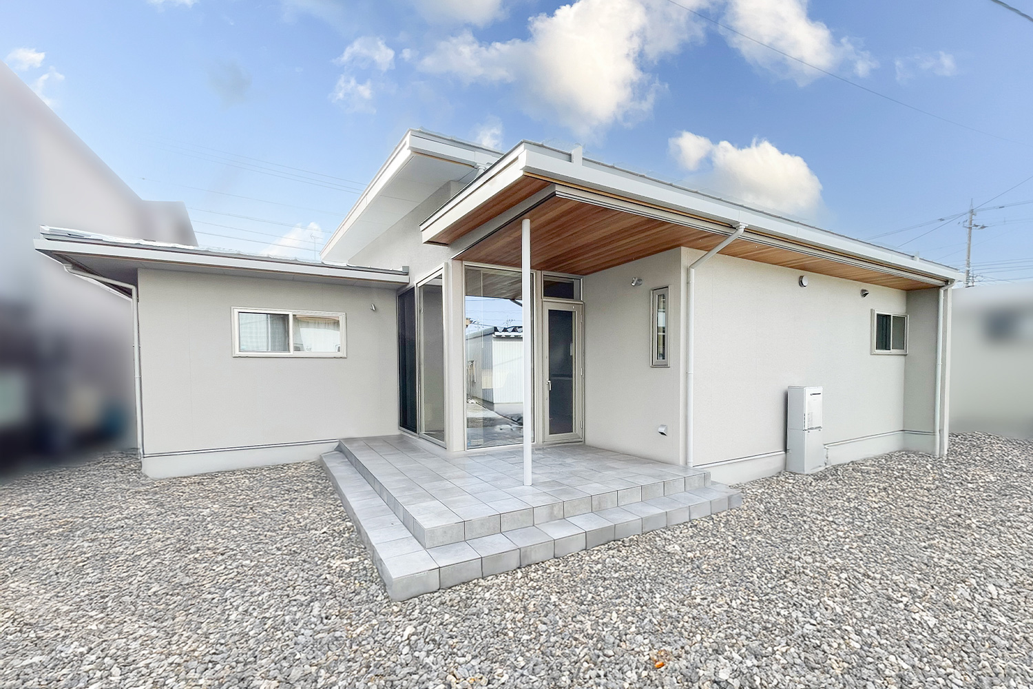 直線的なフォルムが美しいシンプルモダンな平屋。清潔感のある白い外壁に、軒天の木目が映え、上品なファサードを創り出しています。